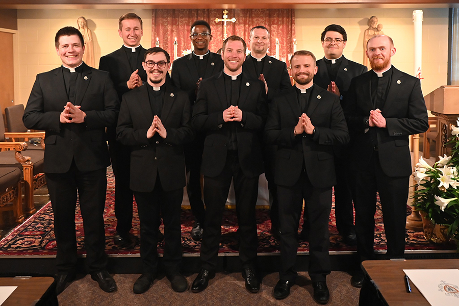 Diocese of Superior seminarians Carl Oman, far left, and Scott Pederson, far right, recited the Oath of Freedom, the Profession of Faith and the Oath of Fidelity at Vespers on April 8 at St. Francis de Sales Seminary in Milwaukee.