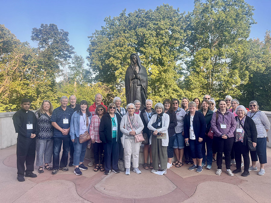Members of St. Dominic in Frederic, Immaculate Conception in Grantsburg and neighboring parishes went on a recent pilgrimage to Wisconsin’s two Marian shrines, Our Lady of Champion near Green Bay and Our Lady of Guadalupe in La Crosse. Stops were also made at St. Anthony’s Spirituality Center in Marathon City and St. Francis Xavier Cathedral in Green Bay. The journey was one of prayer, reflection and inspiration. One pilgrim said it was “a most fulfilling and inspiring pilgrimage. So moved by the blessings we all received spiritually and in friendships.” Under the leadership of Fr. Thomas Sagili, pilgrims lit devotional candles, prayed the rosary, walked the Stations of the Cross, celebrated daily Mass, shared fellowship and logged plenty of steps while exploring sacred grounds. (Submitted photo)